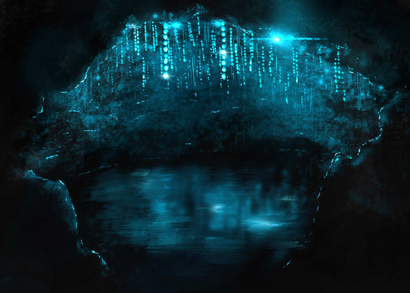 Arachnocampa luminosa. Il s’agit de larves bioluminescentes. La lumière générée joue un rôle important dans la capture de proies. On voit bien sur l’image les fils de gouttelettes de mucus accrochés aux parois de la grotte.