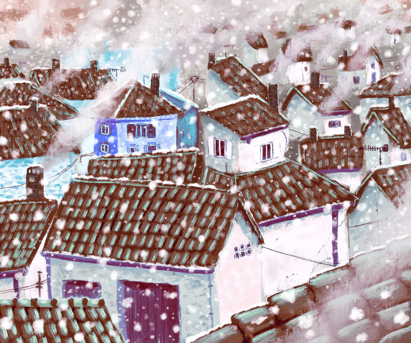 Coup d’œil par la fenêtre et représentation approximative, puis flocons.