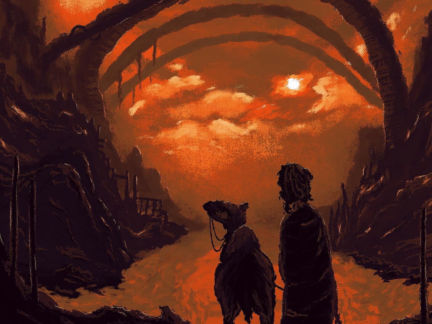 Le thème m’a fait pensé au sable et au désert. Le voyage de deux compagnons m’a donné l’idée d’ajouter ces vestiges qui appellent à l’imagination.
