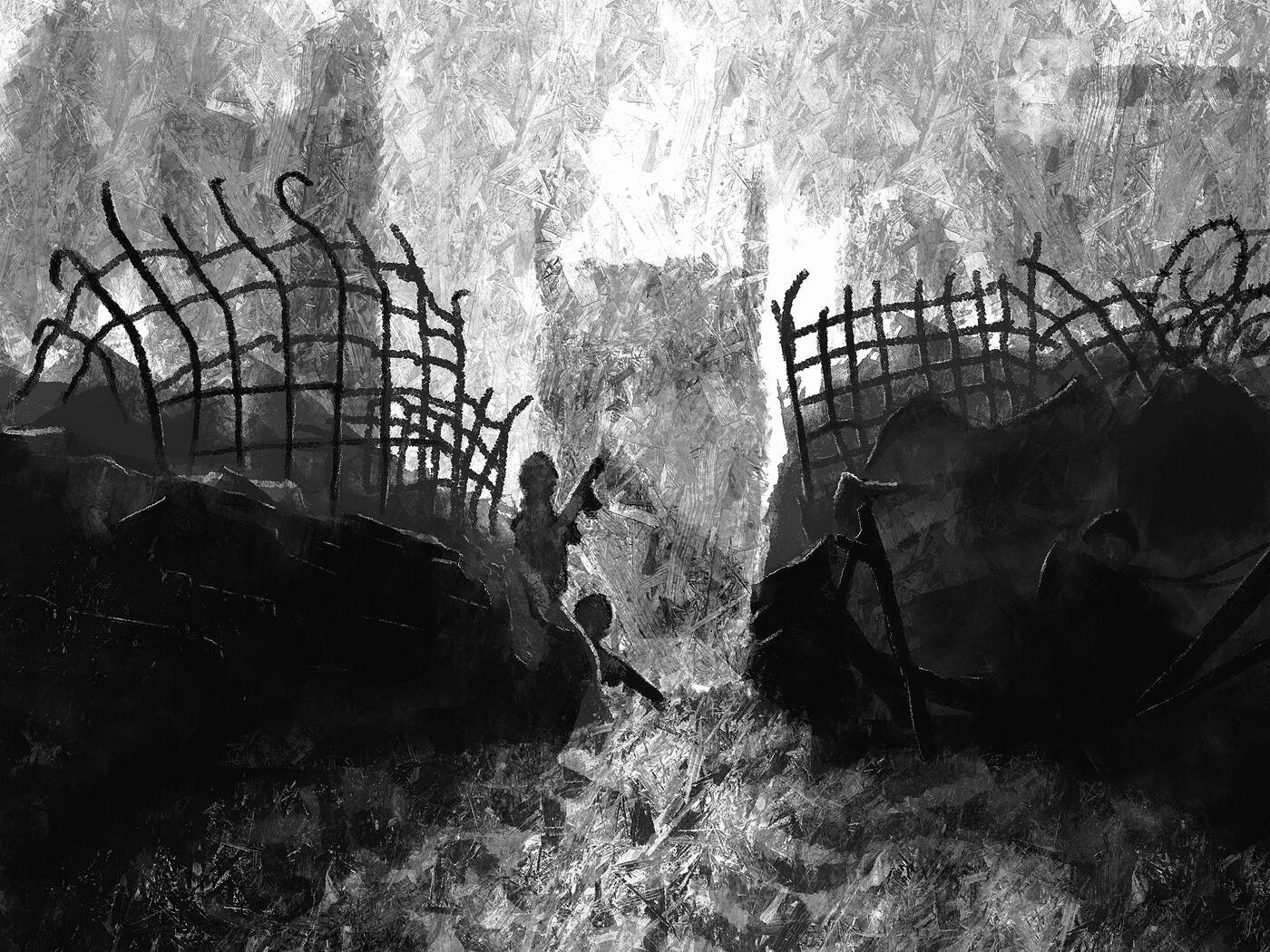 J’ai bien aimé travailler avec ce pinceau. La lumière semble brisée, ce qui va bien avec le thème.