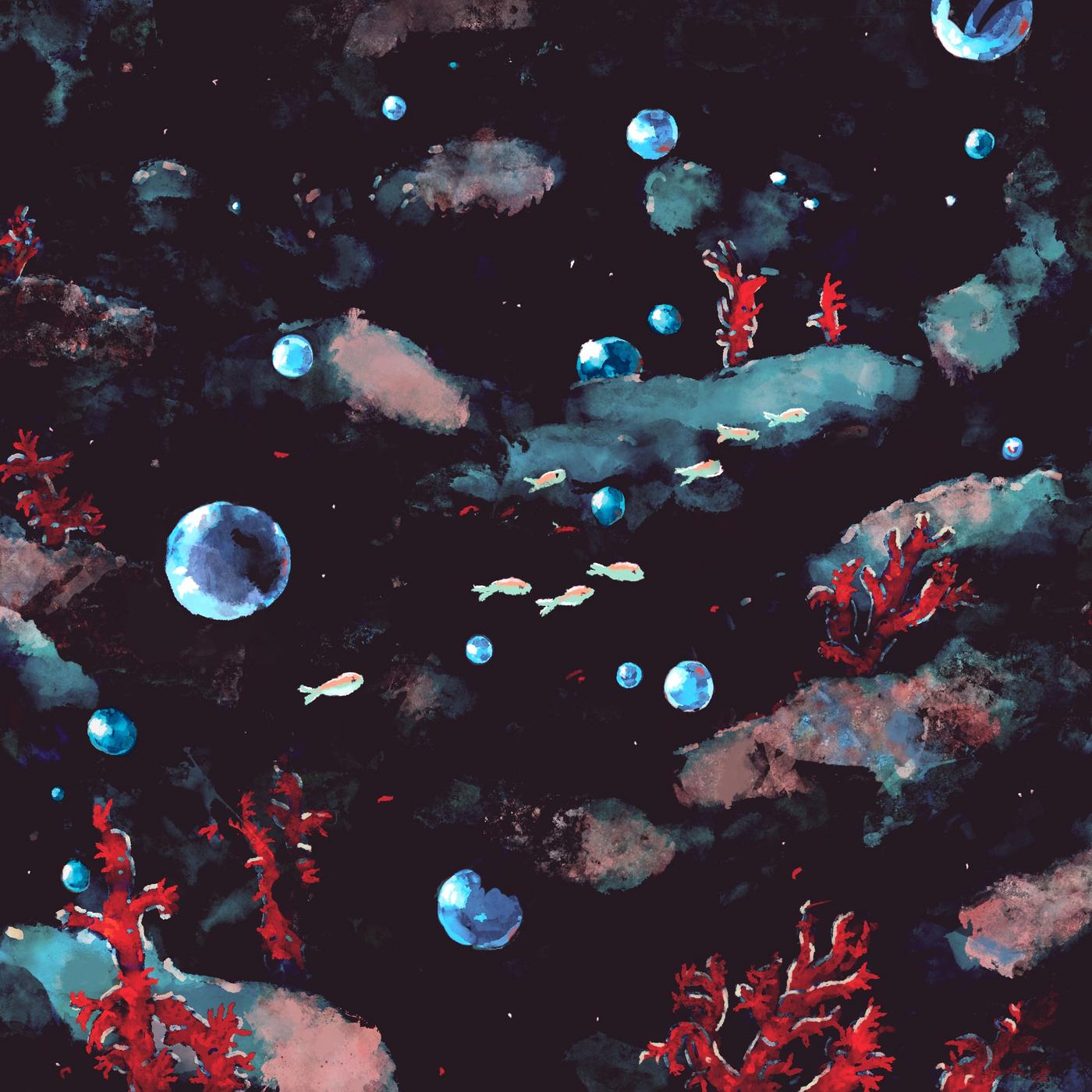 Cette image a été réalisée avec la musique If I were a fish de Múm en tête. J’ai voulu faire en sorte de montrer l’océan tel l’univers avec ce fond noir et l’isotropie qui s’en dégage. Tout semble suspendu en amas.