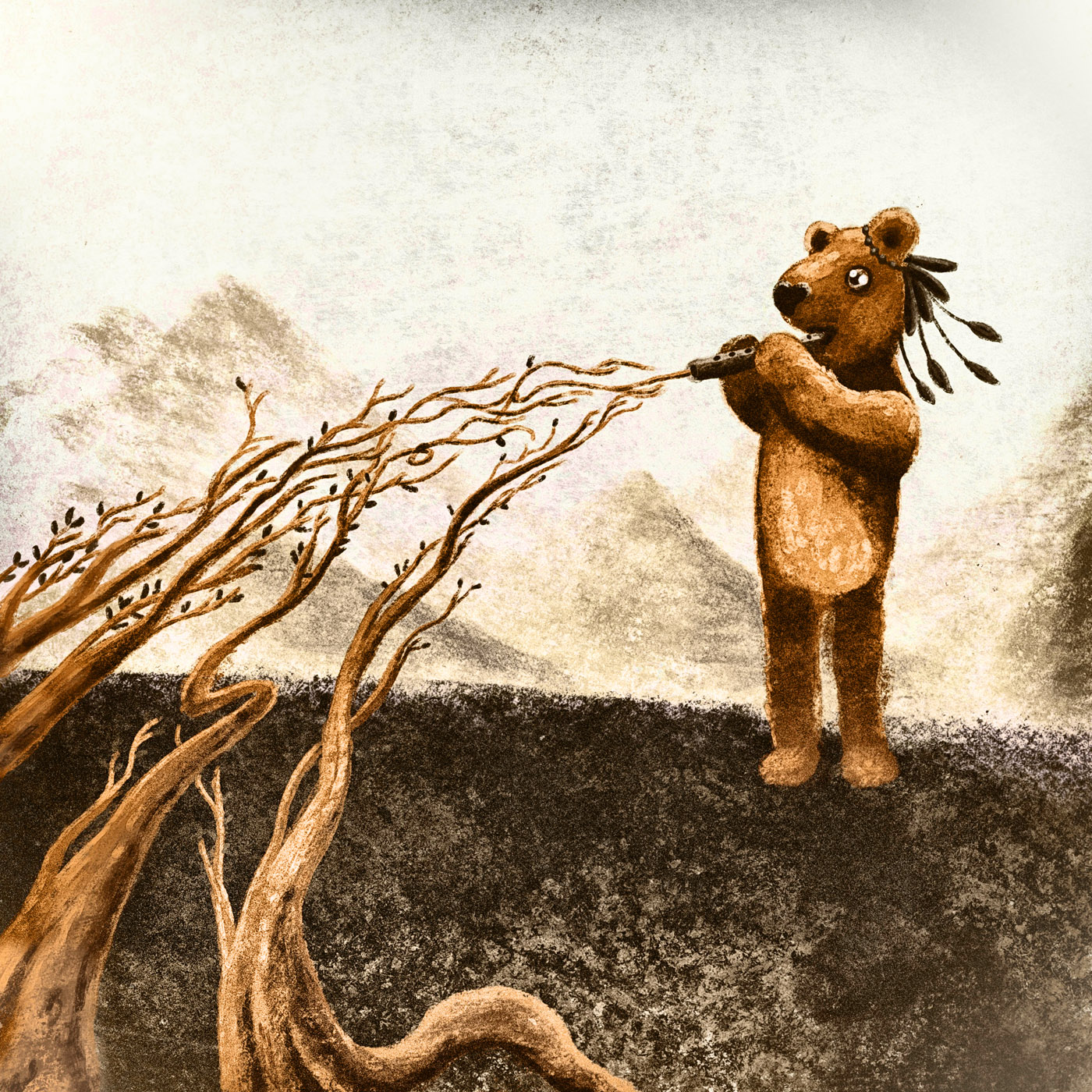 La musique Порою Сжатых Хлебов étant de Рабо́р, je pense aussitôt à la nature, aux paysages rudes et à un petit ourson joyeux jouant de la musique. D’ailleurs, Рабо́р est pour moi le nom de cet ours qui nous offre sa musique magnifique. Cette piste se scinde en plusieurs parties. Il y a un côté mystique au début, puis ça tourne à des instants de joie. L’image a un beau grain et a de belles teintes. L’ensemble est poétique. J’aime le contraste entre le ciel et le sol. À la fin de la réalisation, j’étais un peu déçue du résultat sans trop savoir pourquoi. Puis plus je vois ce dessin, plus je l’apprécie.