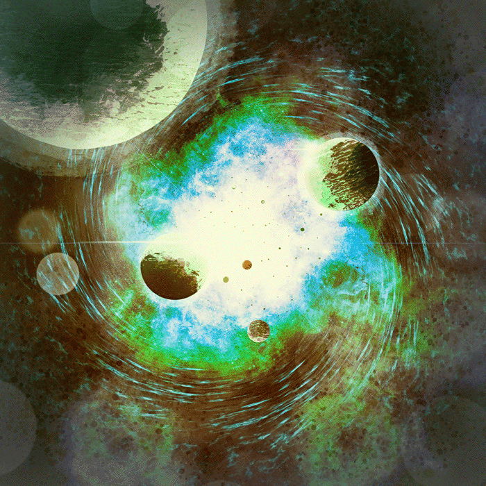 J’avais beaucoup d’idées pour Saku de Susumu Yokota (ce qui est rare) et j’ai pu en combiner plusieurs. On retrouve donc l’émergence de planètes navigant des profondeurs vers la lumière, un rapport à la photosynthèse, une sorte de Big Bang inversé, le grouillement, le plasma. Le résultat me plait beaucoup. Après le défi, j’ai incliné un peu l’une des planètes pour que sa lumière soit dirigée correctement.