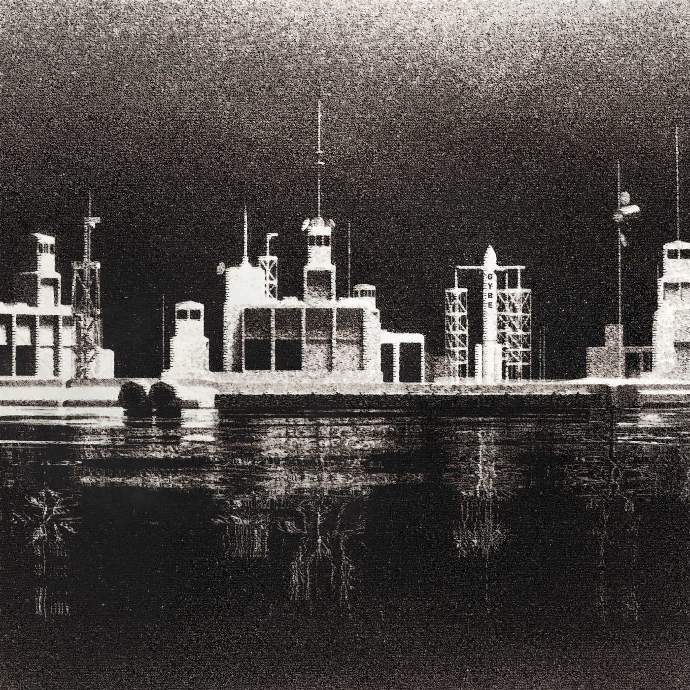 Anthem For No State est une musique en trois actes de Godspeed You! Black Emperor. Il s’agit là d’une œuvre puissante et magnifique dans laquelle je vois au départ notre évolution, puis notre plus grand conflit, contre nous-même et notre propre condition (animale) et, enfin, résonne un son d’espoir. Cet espoir porte le nom de Godspeed You! Black Emperor, d’où les initiales du groupe inscrites sur la fusée. La base spatiale se reflète dans l’eau sous forme d’arbres, empreinte du passé. Et le ciel lumineux d’étoiles pour unique espoir de survie est pointée par nos antennes menaçantes. Notre force dévastatrice pourrait bien s’abattre ailleurs.